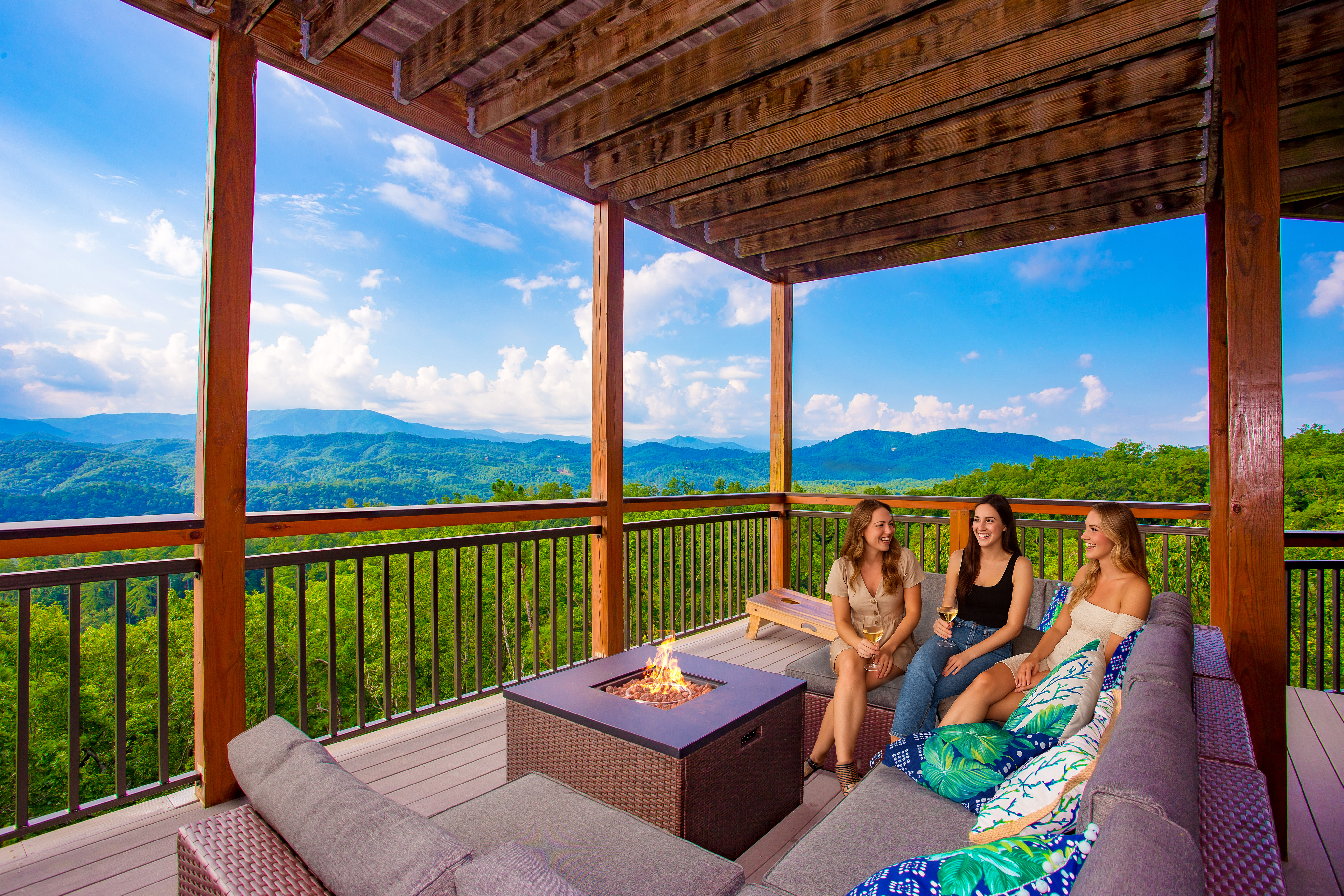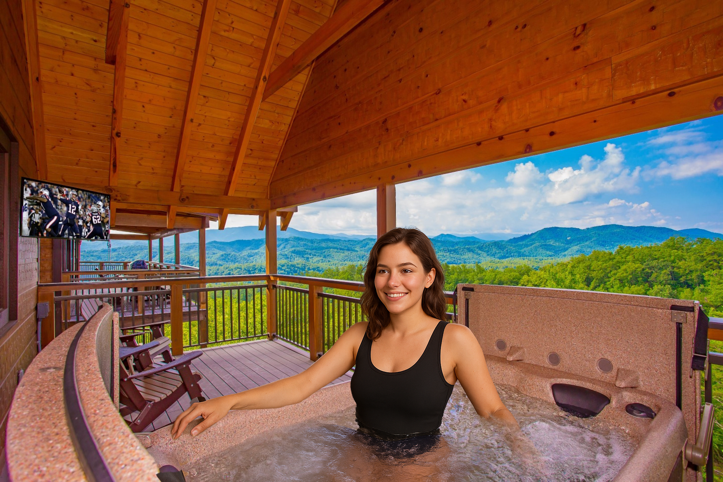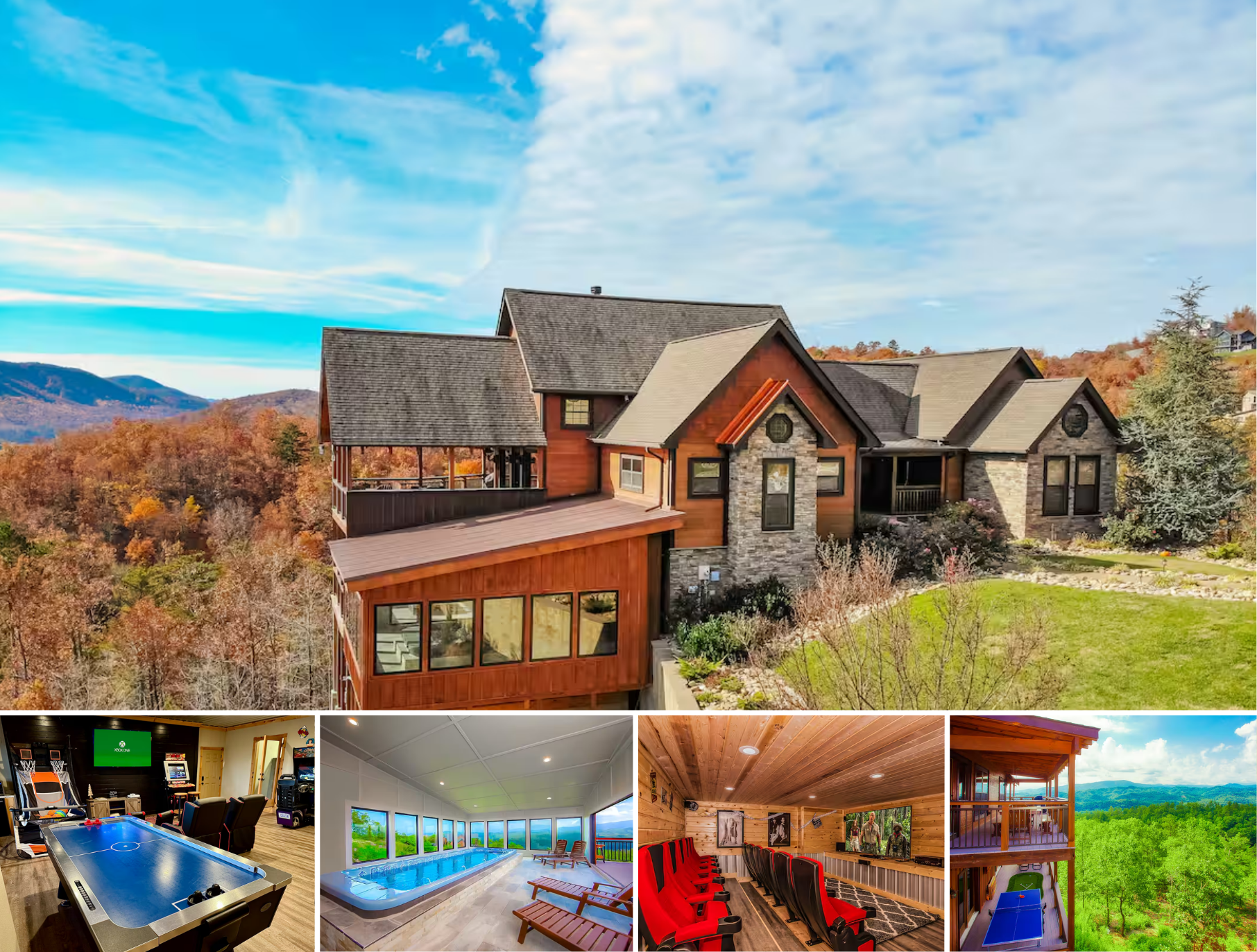 Splashing at the Bluff - Luxury cabin near Gatlinburg-Pigeon Forge within The Summit on Bluff Mountain Resort. Awe inspiring vistas of Mt LeConte and Clingmans Dome, treating guests to stunning sunsets! Parking accommodations up to 5 vehicles with an electric charging station! Amenities include private hot tub, arcade game room, movie theater, heated indoor pool with sensational views, and a private balcony hot tub! Multilevel balconies and a patio firepit with premier rolling mountains views...